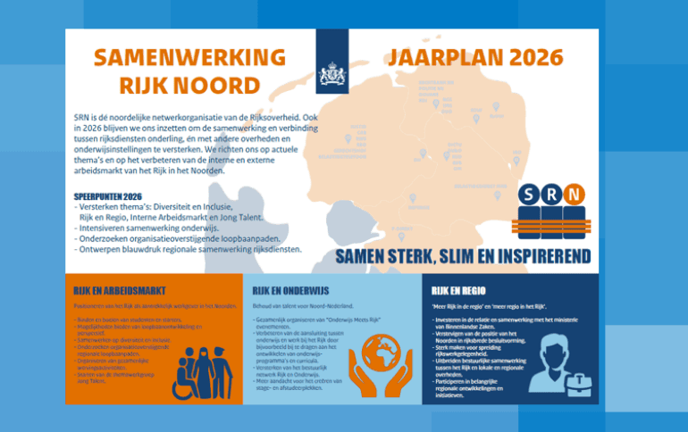 Welkom bij Samenwerking Rijk Noord! Vanuit de Rijksoverheid is SRN dé netwerkorganisatie van Noord-Nederland. We zetten in op onderlinge samenwerking van rijksdiensten, overige overheden en onderwijsinstellingen in de regio. Onder het motto Samen sterk, slim en inspirerend richten we ons op actuele thema's en versterking van de in- en externe noordelijke arbeidsmarkt van het Rijk in het Noorden.