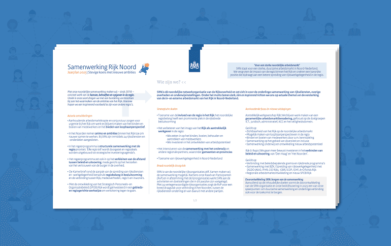 Welkom bij Samenwerking Rijk Noord! Vanuit de Rijksoverheid is SRN dé netwerkorganisatie van Noord-Nederland. We zetten in op onderlinge samenwerking van rijksdiensten, overige overheden en onderwijsinstellingen in de regio. Onder het motto Samen sterk, slim en inspirerend richten we ons op actuele thema's en versterking van de in- en externe noordelijke arbeidsmarkt van het Rijk in het Noorden.